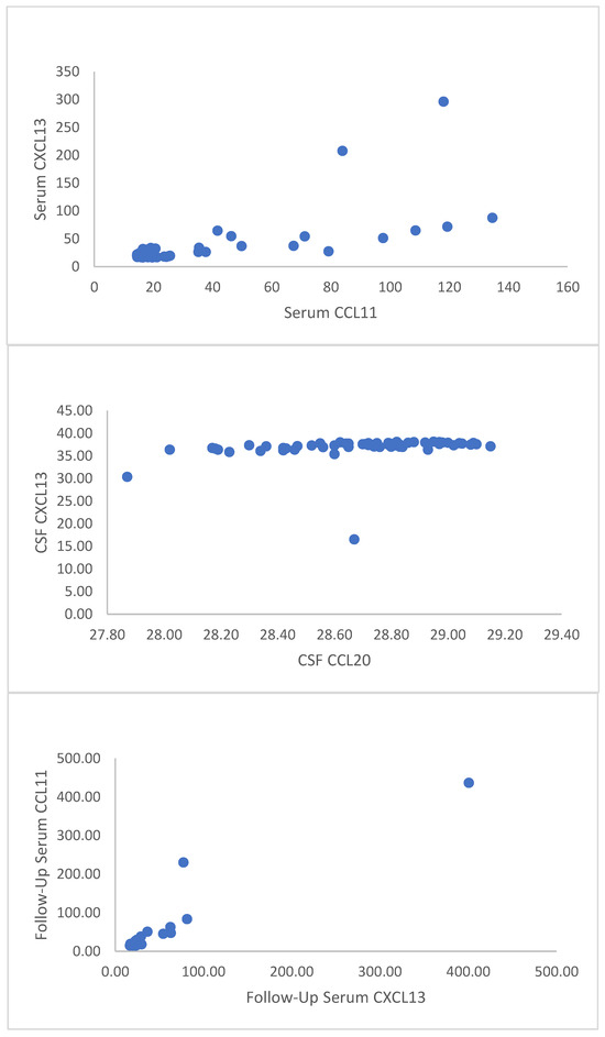 Correlation graphics between baseline serum CXCL13 and serum CCL11 (top), CSF CXCL13 and CSF CCL20 (middle), follow-up serum CXCL13 and follow-up serum CC11 (bottom).