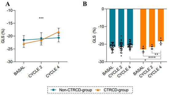 Changes in GLS during anthracycline treatment: (A,B) Evolution of GLS over time in CTRCD-group (n = 5) and non-CTRCD-group (n = 28). Values are presented as means ± SD. Repeated measures ANOVA and multiple comparisons were performed. (*), (**), (***) and (****) indicate significance at p < 0.05, p < 0.01, p < 0.001 and p < 0.0001.