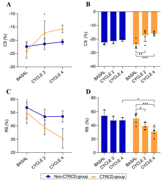 When studying CS in these two groups over time, we found globally significant differences (p = 0.045) as observed in Figure 2A. Figure 2B also shows a significant decrease in CS in the CTRCD group from baseline (−23.88 ± 2.84%) to CYCLE 2 value (−17.19 ± 4.47%) (p = 0.003) and to CYCLE 4 value (−15.69 ± 1.38) (p < 0.001). In case of RS, we did not find global differences between groups (Figure 2C), but, as shown in Figure 2D, there were significant differences in CYCLE 4 ECHO value between CTRCD group (30.62 ± 7.31%) and non-CTRCD group (47.11 ± 4.17) (p = 0.011). As summarized in Figure 2D, there was a significant decrease in RS in the CTRCD group from baseline (49.84 ± 7.98%) to CYCLE 2 ECHO value (38.88 ± 5.45) (p = 0.029) and to CYCLE 4 ECHO value (30.62 ± 7.31%) (p < 0.001). There were no changes over time for CS and RS in non-CTRCD group.