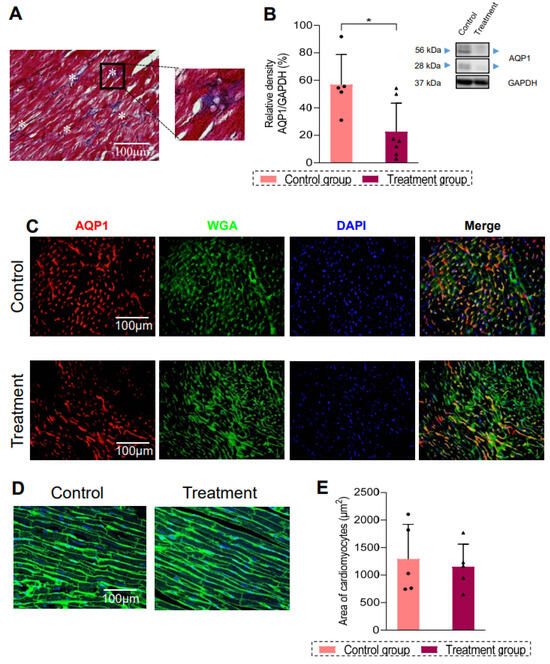 Histological observations revealed alterations in myocardial tissue beyond fibrosis. For instance, Figure 4A shows the presence of small round bubbles between myocardial fibers in treated animals, indicating qualitatively edema. Therefore, we evaluated the level of AQP1 protein, a key player in water homeostasis. As shown in Figure 4B, hearts from treated animals had significantly decreased expression of AQP1 as compared with the controls (p = 0.020). Immunofluorescence of AQP1 and WGA was performed. Control animals showed a high staining of AQP1 (Figure 4C), while rats from the treatment group showed less staining of AQP1 (Figure 4C). The analysis of cardiomyocyte cross-sectional area quantified using WGA indicates a decreased tendency in cell size in treated rats, as shown in Figure 4D and summarized in Figure 4E.