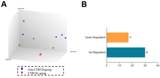 To further analyze possible regulation of genes associated with fibrosis and edema after epirubicin treatment, we performed an array of miRNAs in the serum of patients collected from non-CTRCD-group (n = 5) and in CTRCD-group (n = 5) after CYCLE 4. Figure 5A confirms that data from the two groups are well separated in the principal component analysis (PCA) control, confirming the quality of these samples. As shown in Figure 5B, we found 47 differently expressed miRNAs, particularly, 17 were downregulated and 30 upregulated between the two groups (Table 4). Data in Figure 5C,D show the volcano plot (Figure 5C) and the hierarchical cluster (Figure 5D): patient data from each group that appeared well clustered. Within those miRNAs, has-miR-122-5p exhibits the most considerable fold-change and significant p-value between both groups.
