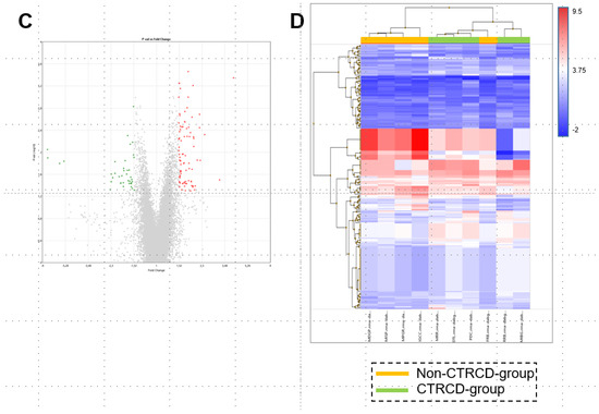 miRNAs differentially expressed between non-CTRCD-group and CTRCD-group: PCA of microRNAs (A) in Non-CTRCD-group (blue, n = 5) and CTRCD-group (red, n = 5) after CYCLE 4. Number of differently expressed genes (B): downregulated (yellow) and up-regulated (blue). Volcano plots (C) and hierarchical clustered (D) plots of −2.0 > fold-change > 2.0 value of microRNAs. In the heat map, non-CTRCD-group is in yellow and CTRCD-group in green. CTRCD: cancer-therapeutics-related cardiac dysfunction.