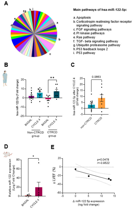 hsa-miR-122-5p in silico analysis and its validation in patients and rats: In silico study (A) of possible microRNAs regulating apoptotic and fibrotic genes. hsa-miR-122-5p validation in human serum (B) of non-CTRCD-group (basal n = 12, in purple; after CYCLE 4 n = 8, in pink) and CTRCD-group (basal n = 12 in turquoise; after CYCLE 4 n = 8 in blue) at basal time and after CYCLE 4. (C) hsa-miR-122-5p expression normalization to basal level in non-CTRCD-group (n = 12, blue) and CTRCD-group (n = 8, orange). hsa-miR-122-5p validation in treated rat serum (D) of treated rats (basal n = 6, in pink; after CYCLE 4 n = 6, in burgundy). PCA: principal component analysis; CTRCD: cancer-therapeutics-related cardiac dysfunction. (E) Simple linear regression of miR-122-5p and LVEF. LVEF: left ventricular ejection fraction. (*) and (**) indicate significance at p < 0.05 and p < 0.01 respectively.