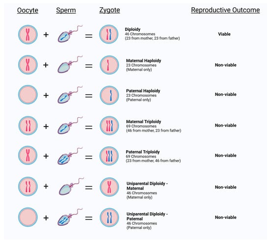 There are three different PN variations observed in IVF. First, the absence of any visible pronucleus (0PN), which could be the result of failed fertilization or that the pronuclei have disappeared by the time of fertilization check [7]. Second, the presence of only one pronucleus (1PN), which is typically considered to be a haploid embryo [8]. Haploid zygotes are not compatible with life due to the complete loss of half of the genome and have never been reported in prenatal testing [2]. The presence of only a single pronucleus can occur due to errors during fertilization, including failure of male or female chromatids to form a pronucleus, uncondensed sperm heads, ejection of the spermatozoon, fusion of the maternal and paternal pronucleus, or parthenogenesis (Figure 1) [9]. Lastly, three pronuclei (3PN), which are considered to be triploid embryos [5], are the most common abnormality associated with first-trimester pregnancy loss [10,11]. There are two types of triploidy: maternally inherited (digynic) or paternally inherited (diandric) (Figure 1). While paternally inherited triploidy commonly results in a molar pregnancy, maternally inherited triploidy results in intrauterine growth restriction, and both types almost always result in pregnancy loss [12]. The formation of 3PN zygotes during IVF after intracytoplasmic sperm injection (ICSI) is thought to occur as a result of a retention of the second polar body [13], but 3PNs can also arise via polyspermic fertilization or oocyte-derived meiotic failure [14]. Although rare, uniparental disomy (UPD) can also occur, where both sets of chromosomes are inherited from only one parent (Figure 1) [15].