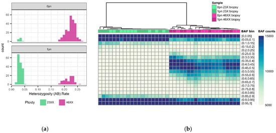 The proportion of heterozygous genotypes was calculated and directly compared to the range of an established library of haploid, triploid, and diploid genome results. Samples with an overall heterozygosity (AB) rate ≤ 5% were considered haploid (based on the Illumina technical guide, where 5% is the mis-call rate that designates noise), while ≥18% were considered diploid (Figure 2). The diploid rate was calculated using historical in-house data from known euploid samples. For 0PN and 1PN blastocysts, GTC files were processed using Illumina’s open-source BeadArrayFiles v1.2.0 (https://github.com/Illumina/BeadArrayFiles, accessed on 5 May 2020) and the v1 manifest file. For 3PN blastocysts, GTC files were processed using the open-source gtc2vcf (https://github.com/freeseek/gtc2vcf, accessed on 5 May 2020) and the v1 manifest and cluster files. All 3PN zygotes were compared to a library of known euploid samples (n = 37 46XY and n = 32 46XX) (Figure 3). Samples exhibiting homozygosity on chromosome Y were tested for 69XXY, while all others were tested for 69XXX. Potential 69XXY samples were tested by assessing the log R ratio (LRR) of chromosome X and comparing that to the euploid database to determine whether one or two X chromosomes were present (Figure 3). A chromosome X mean LRR ≤ −1.0750221 (the maximum chrX mean LRR of a 46XY sample in the euploid database) is considered to be one copy, while a mean LRR ≥ −1.0396700 (the minimum mean chrX LRR of a 46XX sample in the euploid database) is considered to represent two copies. Potential 69XXX samples were tested by assessing the B-allele ratio (BAF) of autosomes. Two BAF regions (0.2–0.3 and 0.7–0.8) are compared to the euploid library. A BAF proportion < 5.89% within the 0.2–0.3 region and a BAF proportion < 4.31% within the 0.7–0.8 region were considered 46XX (Figure 3). Statistical analysis was performed using an unpaired t-test or ANOVA where appropriate.