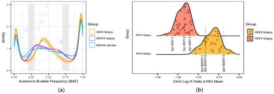 3pn ploidy analysis: (a) density plot of representative autosome B-allele frequency (BAF) for 46XX biopsies (n = 3, orange), 69XXX biopsies (n = 3, purple), and 69XXX cell lines (n = 2, blue). The shaded gray regions represent the two windows that are analyzed to determine ploidy status. (b) Density plot of ChrX log R ratio (LRR) means for representative euploid biopsies (n = 32 46XX, orange and n = 37 46XY, red). The two distributions are distinct and do not overlap. The LRR for representative examples of 3pn 46XY (n = 3) and 3pn 69XXY (n = 3) are shown.