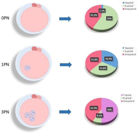 During an in vitro fertilization (IVF) cycle, a fertilization check is performed 16–20 h after insemination where zygotes are morphologically assessed for the presence of pronuclei [1]. Normal fertilization requires proper segregation of the parental genomes for the developing embryo to acquire the correct biparental set of chromosomes [2]. Zygotes with two pronuclei (2PN) and two polar bodies are considered normally fertilized, with the assumption that each pronucleus originated from each of the two parental gametes (Figure 1) [3,4]. However, ploidy abnormalities are well documented in human conceptions. In fact, it is estimated that ~3–10% of inseminated oocytes fail to fertilize normally, and often when an alternate number of pronuclei are observed, these zygotes are discarded due to known chromosomal ploidy abnormalities that lead to implantation failure and/or pregnancy loss [5,6].