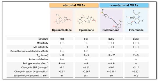 Non-steroidal MRAs, including esaxerenone and finerenone, have different pharmacological profiles to those of conventional steroidal MRAs (spironolactone and eplerenone) since they have different structures and bind differently within the MR ligand-binding domain. They show high affinity and selectivity for MR, and their use is associated with an extremely low incidence of sex hormone-related side effects, such as gynecomastia, and no pharmacologically active metabolites are found [8,9] (Figure 1). A robust body of evidence supporting the clinical utility of non-steroidal MRAs has now accumulated, particularly with respect to patients with hypertension [10,11] or chronic kidney disease (CKD) with type 2 diabetes (T2DM) [12,13,14]. In this review, we aim to summarize the recent clinical and basic evidence regarding the use of MRAs in patients with hypertension and CKD.