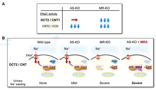 Recently, we investigated the aldosterone-independent activation of the MR–ENaC pathway by comparing the nuclear MR expression, apical α-ENaC expression (indicating ENaC activation), and phenotype of kidney-specific MR-deficient (MR-KO) mice and aldosterone synthase-deficient (AS-KO) mice on a C57BL/6 background [38]. The MR-KO mice showed low nuclear MR and apical α-ENaC expression in both the late DCT (DCT2)/the early connecting tubule (CNT1) and the late connecting tubule (CNT2)/cortical collecting duct (CCD) (Figure 2). By contrast, AS-KO mice showed low MR and α-ENaC expression in the CNT2/CCD, and normal expression in the DCT2/CNT1 (Figure 2). Phenotypically, the MR-KO mice exhibited a salt-losing state, high serum K+ concentrations, and low serum Na+ concentrations, whereas the AS-KO mice exhibited only slightly high serum K+ concentrations and slightly low phosphorylated NCC (pNCC) expression. Notably, whereas MR-KO mice showed persistently high Na+ excretion when consuming a low-salt (LS) diet, in AS-KO mice the high Na+ excretion was only temporary. However, eplerenone administration to AS-KO mice consuming an LS diet induced a salt-losing state that was similar to the phenotype of the MR-KO mice, characterized by a high level of Na+ excretion, high serum K+ concentration, and high blood urea nitrogen concentration [38] (Figure 2), suggesting that the MR–ENaC pathway is important for the role of DCT2/CNT1 in sodium homeostasis. This contention is supported by the results of experiments using several animal models and patch clamps. Furthermore, mice in which γ-ENaC and MR were deleted in the epithelial cells along the entire nephron exhibited salt-wasting syndrome and hyperkalemia [4,39,40], whereas those with a deletion of MR along CNT2 and CCD exhibited only a mild phenotype, characterized by normal renal Na+ excretion but a high aldosterone concentration [41]. Patch clamp experiments demonstrated that the ENaC current is larger along DCT2/CNT1 than CNT2/CCD [42,43]. These findings suggest that the activation of MR–ENaC in DCT2/CNT1 occurs independently of aldosterone and plays a crucial role in sodium reabsorption, consistent with the notion that MRAs have potent antihypertensive effects, even in patients with RHTN and low-to-normal plasma aldosterone concentrations. In addition, whereas MR was highly expressed in DCT2, the expression of 11β-hydroxysteroid dehydrogenase type 2, which inactivates cortisol, was very low [38], consistent with the activation of MR in DCT2/CNT1 by cortisol (Figure 2).
