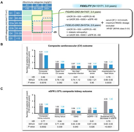 Results of the FIDELITY analysis, an analysis of data from the FIGARO-DKD and FIDELIO-DKD trials. (A) Inclusion and exclusion criteria for the FIGARO-DKD and FIDELIO-DKD trials. A total of 13171 patients were included in the FIDELITY integrated analysis, with a follow-up period of 3 years. (B) Results of the composite cardiovascular outcome in the FIDELITY analysis. Finerenone reduced the risk of an initial occurrence of the cardiovascular composite outcome by 14% and the risk of hospitalization because of heart failure by 22% versus placebo. (C) Results of the composite kidney outcome in the FIDELITY analysis. Finerenone reduced the risk of an initial occurrence of the composite renal outcome by 23% and the risk of the initiation of renal replacement therapy by 20% versus placebo. UACR: urinary albumin creatinine ratio, RAAS-i: renin–angiotensin–aldosterone system inhibitor, HFrEF: heart failure with reduced ejection fraction, NYHA: New York Heart Association classification, ESKD: end-stage kidney disease. These figures were summarized from references [12,13,57].
