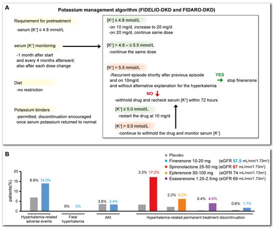 Management and incidence of hyperkalemia in the FIDELIO-DKD and FIGARO-DKD trials. (A) The potassium management algorithm used in the FIDELIO-DKD and FIGARO-DKD trials. (B) Incidences of hyperkalemia, related adverse events, and discontinuation of each MRA because of hyperkalemia. The incidence of hyperkalemia was higher in the finerenone group than in the placebo group (14.0% vs. 6.9%), but there were no deaths and few instances of severe hyperkalemia. The incidence of discontinuation owing to hyperkalemia was also lower than those for other MRAs. AKI: acute kidney injury. These figures were summarized from references [12,13,14,55,56,57].