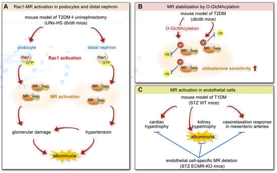 MR activation in mouse models of diabetes. (A) Activation of the Rac1–MR pathway in glomerular podocytes and distal nephrons. The Rac1–MR pathway was activated in db/db mice fed a high-salt diet for 10 weeks after unilateral nephrectomy versus control mice (UNx-HS db/m mice), resulting in glomerular damage and hypertension with massive albuminuria. (B) MR stabilization by O-GlcNAcylation. O-GlcNAcylation increased the sensitivity of the db/db mice to aldosterone by stabilizing MR activity. (C) MR activation in endothelial cells. The hypertrophy of the heart and kidneys, massive albuminuria, and inhibition of the vasorelaxation response in mesenteric arteries that characterized the STZ WT mice were reduced in the STZ ECMR-KO mice. T2DM: type 2 diabetes mellitus, UNx: unilateral nephrectomy, HS: high-salt, O-GlcNAcylation: O-linked-N-acetylglucosamine, T1DM: type 1 diabetes mellitus, STZ: streptozotocin, WT: wild type, ECMR: endothelial cell-specific MR. These figures were based on references [90,91,92].