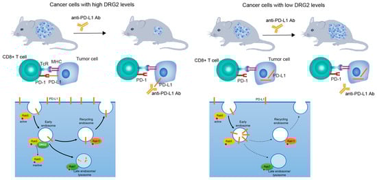 Recently, Choi et al. [1] identified the role of DRG2 in the endosomal trafficking of PD-L1, providing insights into why some patients with high PD-L1 expression do not respond to ICIs (Figure 1). PD-L1 on the cell surface is continuously internalized via endocytosis and directed to Rab5-positive early endosomes. From there, PD-L1 is either sorted toward Rab7-positive lysosomes for degradation or Rab11-positive recycling endosomes for recycling back to the cell surface [16,17,18,19]. DRG2 controls the endosomal trafficking of PD-L1, which is directly linked to its regulation of Rab5 activity. Rab5, localized to early endosome, is crucial for early endocytosis. However, for endosomal trafficking to lysosomes or recycling endosomes, Rab5 must be deactivated on early endosomes [20,21]. Previously, Mani et al. [22] reported that DRG2 plays an essential role in deactivating Rab5 by facilitating the interaction between Rab5 and RabGAP5. DRG2 depletion impairs Rab5 deactivation on early endosomes, blocking trafficking to recycling endosomes or lysosomes, and causing surface proteins to accumulate in early endosomes [22,23]. Consistently, Choi et al. [1] demonstrated that while DRG2 depletion enhanced PD-L1 expression, it induced the accumulation of PD-L1 in Rab5-positive early endosomes.