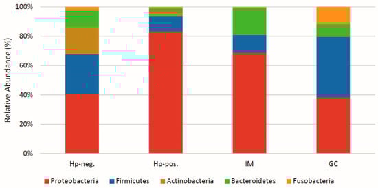 - Bik, E.M.; Eckburg, P.B.; Gill, S.R.; Nelson, K.E.; Purdom, E.A.; Francois, F.; Perez-Perez, G.; Blaser, M.J.; Relman, D.A. Molecular Analysis of the Bacterial Microbiota in the Human Stomach. Proc. Natl. Acad. Sci. USA 2006, 103, 732–737. [Google Scholar] [CrossRef] [PubMed]