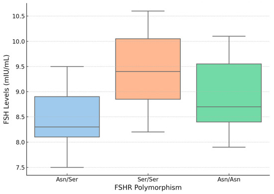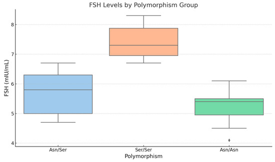 Scheme 3 depicts the distribution of FSH levels (mIU/mL) following surgery across the FSHR polymorphism groups (Asn/Asn, Asn/Ser, and Ser/Ser). The box represents the interquartile range (IQR); the line within the box denotes the median, and the whiskers extend 1.5 times the IQR. Outliers are represented as isolated points beyond the whiskers.