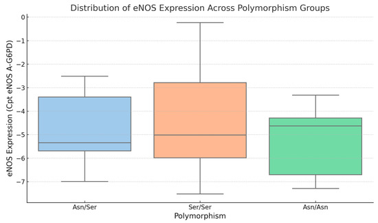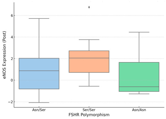 Scheme 5 depicts the distribution of endothelial nitric oxide synthase (eNOS) expression levels among FSHR polymorphism groups (Asn/Asn, Asn/Ser, Ser/Ser) following surgery. The central line in each box reflects the median eNOS expression, whereas the box margins denote the interquartile range (IQR). Whiskers extend to the minimum and maximum values within 1.5 times the IQR; any points outside this range are considered outliers.