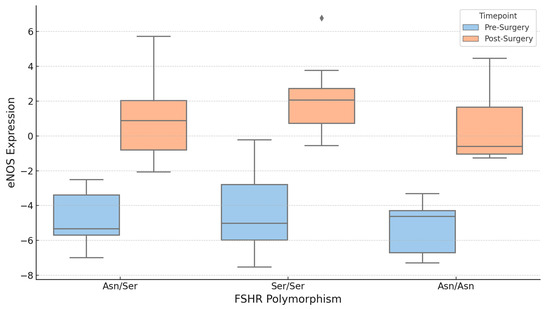 Scheme 6 compares eNOS expression levels among FSHR polymorphism groups (Asn/Asn, Asn/Ser, Ser/Ser) at two time points: before and after surgery. The central line in each box reflects the median eNOS expression, whereas the box margins denote the interquartile range (IQR). Whiskers extend to the minimum and highest values of 1.5 times the IQR. Pre-surgery data are shown in blue, while post-surgery data are in orange.