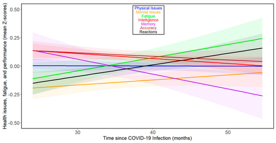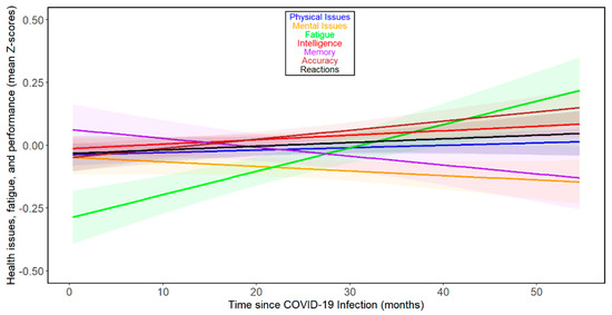 The results for all participants showed a noticeable, relatively small decline in memory performance over the time elapsed since infection. In contrast, trends of marginal improvement in mental health issues, accuracy, and intelligence were observed. Fatigue showed the largest increase over the time elapsed since infection. Marginal trends of deterioration in reaction times and physical health were also present (see Figure 1 and Table 2). The results of separate analyses for women and men are shown in Supplementary Figures S1 and S2 and Supplementary Tables S2–S5.