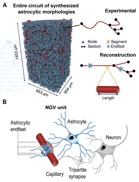 Model overview. (A) The left side shows a complete circuit with synthesized astrocytic morphologies developed by Zisis et al. []. Astrocytes are shown in blue and blood vessels in red. On the right, there is a schematic depiction of a realistic microvascular network sample, comprised of nodes and edges. A dot represents a node, two dots connected by a line represent an Section (an edge between every bifurcation), a black line framed by vertical orange lines represents a Segment (an edge between every Section), and a star represents an endfoot. (B) NGV unit. Neurons are depicted in gray, astrocytes in blue, and capillaries in red. Astrocytes contact synapses, wrap around them, and extend their perivascular projections to the surface of blood vessels, where they form endfeet. r stands for radius.