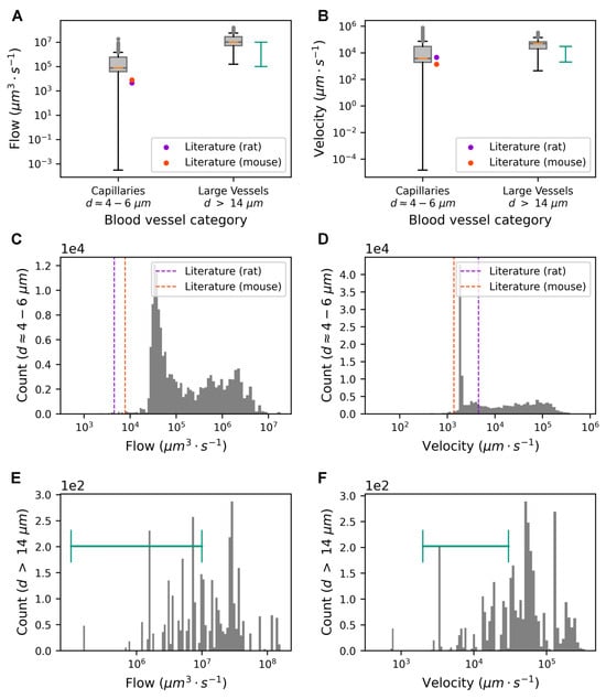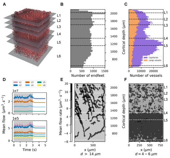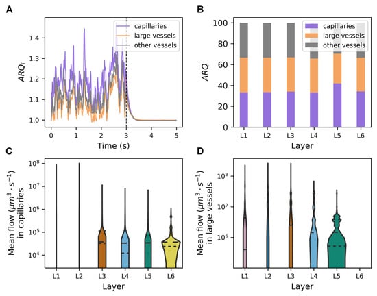 The low percentage of vessels within L6 can be attributed to the limitations of the experimental data set. This data set only contained a cropped portion of L6, resulting in a relatively small representation of this layer. It was imperative to consider L6 while performing our analyzes, even if its data set was limited. The flow ratio highlights the proportion of flow in capillaries and large vessels. The sum was smaller than 100% as we exclusively considered capillaries (diameters smaller than 6 m) and large vessels (diameters larger than 14 m) among various types of vessels. The decision to exclude other vessels was made to emphasize the distinctive behaviors of capillaries and large vessels. Capillaries are crucial for the exchange of nutrients and gases at the cellular level, while large vessels are vital for the rapid transport of blood and the regulation of pressure. By focusing on these extremes, our analysis could better capture the specific roles and responses of these vessel types under various physiological and pathological conditions. This approach facilitated easier validation of our results against the existing literature because extensive research and data are more readily available for these types of vessels, providing well-documented benchmarks for comparison [,,].