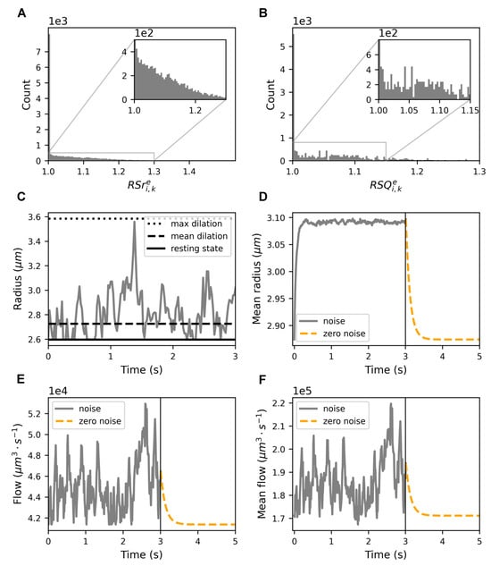 The responses to endfeet activity differ between capillaries and large vessels (radii modulation in Section 2). We used average data reported in the literature to set the maximum dilation, the maximum radius ratio, for both vessel types. In particular, it was set to 1.38 for capillaries and 1.23 for large vessels, based on [,,,,,,,]. We also set the time it took to reach the maximum radius, the time to peak, for both vessel types. The duration represents the average duration from the onset of the stimulus to the time when the maximum dilation was reached. In our simulations, we fixed this time to peak at 2.7 s for capillaries and 3.3 s for large vessels (see Section 2, Table 2 and Table 3, and [,,,,,,,]). Our choice of a 2.7-s time scale for the hemodynamic response represents an averaged simplification that captures the general dynamics observed experimentally. We acknowledge that fast (hundreds of milliseconds to seconds) responses are thought to be driven by rapid potassium signaling [], while slower modulation occurs on the order of ten to hundreds of seconds, influenced by neuromodulators [,]. Nevertheless, the 2.7 s time scale was chosen to balance these effects and reflect intermediate responses typical in neurovascular modeling. In Figure 3A,B, we highlight the distribution of the resting state ratio for radius and flow. The histograms in Figure 3A,B consider all edges connected exclusively to a single endfoot, at every time point. According to the literature [,,,,,,,] and the implementation of our model (see Section 2), (see Equation (6)) was concentrated between 1 and 1.3, showing a peak close to 1.0 and gradually decreasing to 1.3.