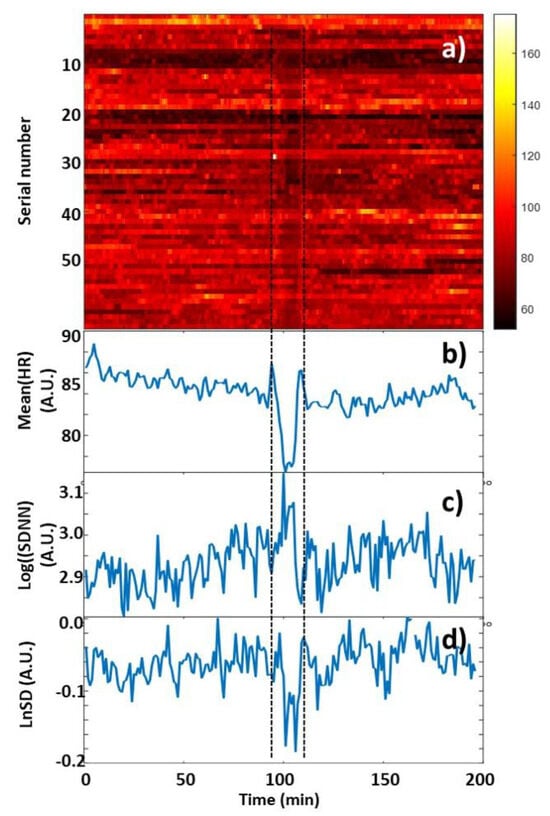 (a) Map of the HR time series (90 tachograms), synchronized to the start of the relaxation process. The HR values are color-coded. (b) The averaged tachogram of all the measurements. (c) Log(SDNN) and (d) LnSD time series, as averaged over each measurement.