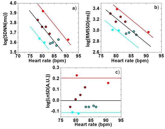 To clarify what we are talking about, all the data values presented in Table 1 and Table 2 have been plotted on a single graph in such a way that the SDNN, the RMSSD, and the normalized variability, LnSD, are presented as a function of the heart rate (Figure 7). In the case of SDNN, it can be seen that the data from different measurements show the same trend, and there is a well-defined baseline. The vertical axis is logarithmic, so when plotted in the semi-logarithmic plot, we obtain just a straight line, which is consistent with the fact that the heart rate dependence is exponential. In this plot, for both types of stress, SDNN values are shifted upward from the baseline, even for SEST, which is exactly the opposite of what the standard assessment would predict. Also, in the relaxation experiments, the variability just moves downwards, in contrast with the standard evaluation.
