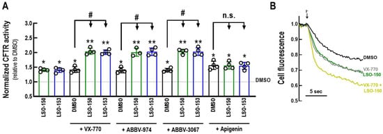 As LSO-150 and LSO-153 demonstrated a slightly greater potency compared to the other active compounds (i.e., LSO-149, LSO-151, and LSO-154), we used those two for subsequent experiments. We then interrogated whether a further enhancement of CFTR activity could be attained by the combined treatment of LSO-150 or LSO-153 with known CFTR potentiators, namely VX-770, ABBV-974, ABBV-3067, and apigenin, on CFBE41o− cells co-expressing HS-YFP and p.Arg334Trp-CFTR. Upon Fsk stimulation, a further increase in the fluorescence quenching rate was observed in the cells treated with LSO-150 or LSO-153 in combination with VX-770, ABBV-974, or ABBV-3067 (Figure 2). However, the combination of LSO-150 or LSO-153 with apigenin exhibited an equivalent cell-fluorescence quenching rate to that of each compound individually.