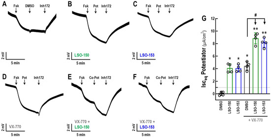 Functional evaluation of single and combined potentiator treatment on CFTR-mediated current by micro-Ussing chamber measurements. (A–F) Representative tracings of polarized monolayers of CFBE41o− cells expressing p.Arg334Trp-CFTR in micro-Ussing chambers. During the recordings, cells were sequentially treated (as depicted by arrows) with Fsk (0.128 μM), tested compounds ([A] DMSO; [B] 3 μM LSO-150; [C] 5 μM LSO-153; [D] 3 μM VX-770; [E] 3 μM VX-770 + 3 μM LSO-150; or [F] 3 μM VX-770 + 5 μM LSO-153) and Inh-172 (30 μM). (G) Data are depicted as mean ± SD of 4 independent experiments. Data reported are the amplitude of the Isceq elicited by single or combined potentiators after CFTR stimulation with Fsk: * p < 0.05; ** p < 0.01 vs. DMSO; # p < 0.05 vs. single potentiator.