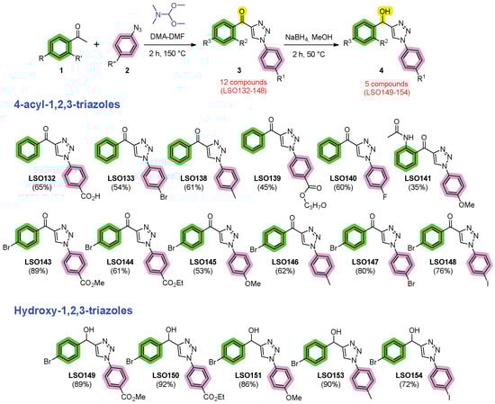 The compounds under study were synthesized by the Laboratório de Síntese Orgânica (LabSint) from PUC-Rio and structurally characterized as reported previously [35]. Briefly, the desired acetophenone (1, 0.5 mmol), N,N-dimethylformamide dimethyl acetal (DMA-DMF, 1.0 mmol), and suitable azidobenzene (2, 0.75 mmol) were combined in a vial equipped with a magnetic stirring bar and wrapped in aluminum foil. The mixture was heated at 150 °C for 2 h. Thereafter, the reaction mixture was poured into ice-cold ethanol and allowed to precipitate in the refrigerator. The resulting 4-acyl-1,2,3-triazole (3) was vacuum filtered, washed with ice-cold ethanol, and dried under reduced pressure.