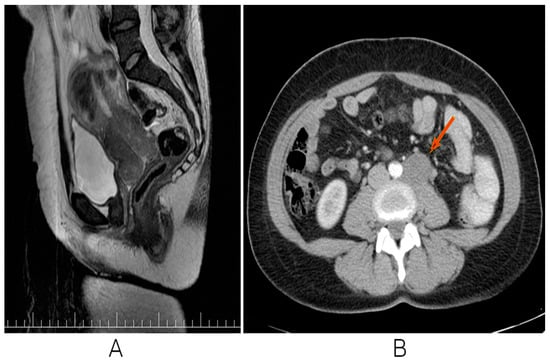 An MRI of the pelvis was performed, which revealed a T2 hypointense lesion measuring 6.5 cm × 6 cm × 5 cm centered on the cervix, without gadolinium enhancement. External common iliac ganglia on the left side were also described. Other important mentions are two uterine body fibromas and bilateral ovarian cysts without any clinical relevance. An abdominal CT with contrast agent was performed, which designated retroperitoneal adenopathy with voluminous ganglion located on the inferior retroperitoneum measuring 3.5 cm × 3 cm. No other prevalent findings were recorded. All the manifestations of the observed results are mentioned in detail in Figure 1.