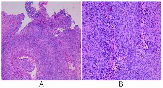 A cervical biopsy’s histological diagnosis is the gold standard for diagnosing cervical precancerous lesions and cervical cancer. After performing the biopsy from the cervix, the histopathological diagnosis of non-keratinized squamous carcinoma of the cervix G2 was confirmed (Figure 2).