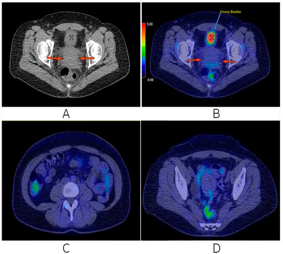 The treatment continued with conventional 3D external radiotherapy with a total dose of 63 Gy on the tumor volume, respectively, and chemotherapy for the purpose of radio sensitization. Chemotherapy was performed with a standard treatment dose of Cisplatin 100 mg/m2 every 3 weeks. Radiotherapy sessions were well tolerated, with the mention that the patient had mild nausea after taking Cisplatin. After the end of external radiotherapy, three more sessions of HDR brachytherapy with Ir192 with 7 Gy per session were performed every week. After the end of the local treatments, 4 weeks later, an imaging assessment was performed with PET CT with FDG. Compared to the previous two examinations, the evolution was favorable; the complete response and persistence of a residual mass of about 2.5 cm at the level of the cervix was observed, but without associated FDG capture. Grade 2 right hydronephrosis was in discrete remission, with the preservation of renal function. Almost complete morpho-metabolic remission of the retroperitoneal adenopathy mentioned in the previous examination was observed. No pelvic or inguinal lymphadenopathy, morphological changes, or FDG activity were detectable (Figure 5).
