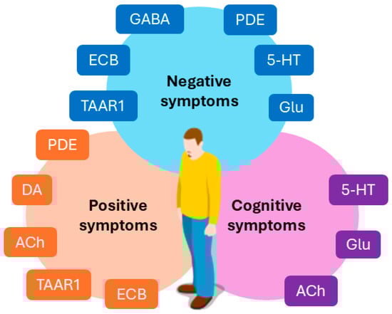 An overview of the neurotransmitters involved in positive, negative, and cognitive symptoms in schizophrenia. GABA: γ-aminobutyric acid; DA: dopamine; Glu: glutamate; ACh: acetylcholine; 5-HT: serotonin; TAAR1: trace amine-associated receptor 1; PDE: phosphodiesterase enzymes; ECB: endocannabinoid system.