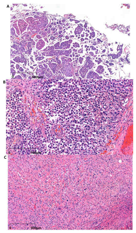 SUC is a rare and highly aggressive subtype of UC, accounting for approximately 0.1–0.3% of all bladder tumors. This malignancy is characterized by high-grade sarcomatous differentiation, with approximately 50% of patients presenting with metastatic disease at the time of diagnosis, resulting in a poor prognosis. The development of SUC is often linked to prior exposure to DNA-damaging agents such as cyclophosphamide or radiotherapy, which induce mutational events such as TP53 alterations [76]. Histologically, SUC consists of malignant spindle cells with a mesenchymal phenotype and may differentiate into diverse mesenchymal lineages, including osteosarcoma, rhabdomyosarcoma, or chondrosarcoma (Figure 1C). The WHO classifies SUC as a high-grade malignancy owing to its mixed epithelial and mesenchymal components, complicating its differentiation from pure sarcomas. Immunohistochemical markers, such as cytokeratin and GATA3, are essential for diagnostic confirmation, and the extent of the sarcomatoid component (>50%) is a critical prognostic factor, warranting specific reporting in pathological evaluations [77,78].