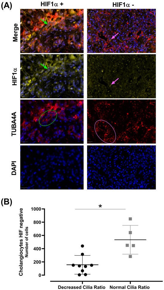 - Quelhas, P.; Breton, M.C.; Oliveira, R.C.; Cipriano, M.A.; Teixeira, P.; Cerski, C.T.; Shivakumar, P.; Vieira, S.M.G.; Kieling, C.O.; Verde, I.; et al. HIF-1alpha-pathway activation in cholangiocytes of patients with biliary atresia: An immunohistochemical/molecular exploratory study. J. Pediatr. Surg. 2023, 58, 587–594. [Google Scholar] [CrossRef]