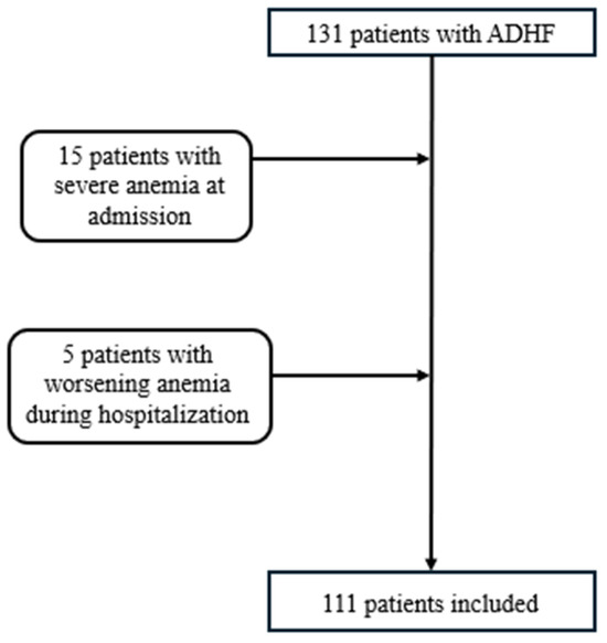 The patient selection process for the study is detailed in Figure 1. Initially, 131 patients with ADHF were identified; however, 15 patients were excluded due to severe anemia at admission. An additional five patients were excluded because of worsening anemia during hospitalization. As a result, a total of 111 patients were included in the final analysis.