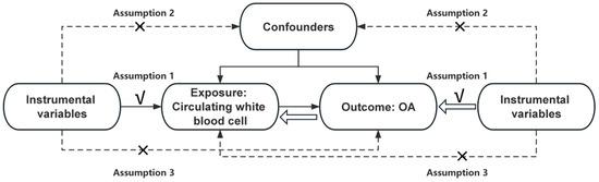 This study adhered to the three key assumptions of MR in two-sample MR analysis: (1) IVs are significantly associated with the exposure; (2) IVs are independent of any confounders affecting the relationship between exposure and outcome; (3) IVs are not directly related to the outcome [33]. A bidirectional two-sample MR analysis was performed to investigate the potential causal relationship between circulating WBC counts and OA. First, a two-sample MR analysis was conducted using circulating WBC counts as the exposure and OA as the outcome. Then, a reverse two-sample MR analysis was performed, treating OA as the exposure and circulating WBC counts as the outcome. Figure 1 provided an overview of the bidirectional MR design and the three key MR assumptions.