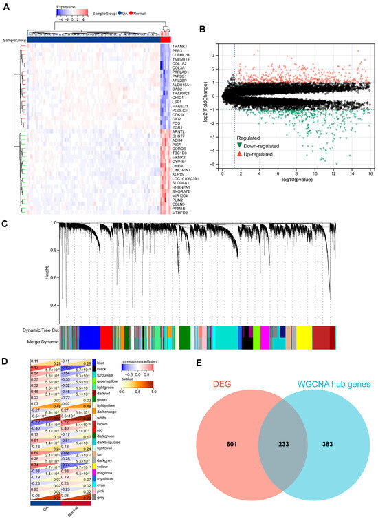 The identification of DEGs and WGCNA hub genes. (A) The heatmap displays the expression of the top 20 upregulated (red) and downregulated (blue) genes in OA. (B) Volcano plot showing all DEGs between the OA group and the normal group, with significantly upregulated (red) and downregulated (green) genes. (C) Gene modules identified by WGCNA. (D) Correlation analysis between gene modules and OA: positive (red) and negative (blue) correlations. (E) Intersection of 834 DEGs and 616 WGCNA hub genes.