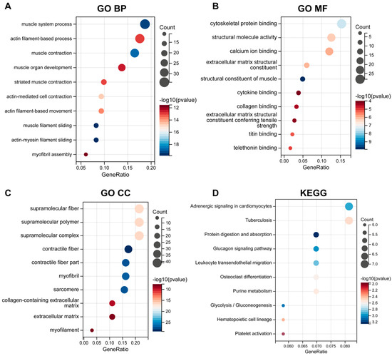 Gene ontology (GO) and Kyoto encyclopedia of genes and genomes (KEGG) enrichment analyses were performed using the R package “clusterProfiler” (version 4.8.3) [31]. A p-value of <0.05 and a false discovery rate (FDR) value of <0.05 were set as thresholds for statistical significance. The GO enrichment analysis covered three categories: biological processes, molecular functions, and cellular components.