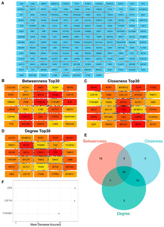 Construction of the PPI network and selection of hub genes. (A) The PPI network of 156 OA-related genes, constructed using STRING, excluding 77 DEGs due to a lack of interaction. (B–D) Betweenness (B), closeness (C), and degree (D) algorithms were employed to select the top 30 hub genes in Cytoscape, with darker colors indicating greater significance. (E) Intersection of the top 30 hub genes from betweenness, closeness, and degree algorithms. (F) Mean decrease accuracy, based on random forest algorithm, was used to rank the predictive importance of OA-related genes and identify the three most critical key OA-related genes.