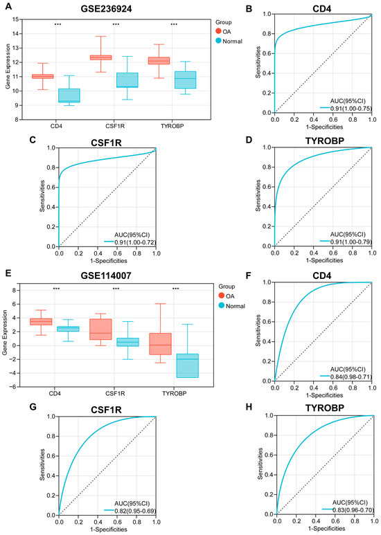 Evaluation of the diagnostic value of three key OA-related genes. (A) Expression differences of CD4, CSF1R, and TYROBP between OA and normal tissues in the GSE236924 cohort. (B–D) The ROC curves used to evaluate the diagnostic efficacy of CD4 (B), CSF1R (C), and TYROBP (D) in identifying OA in the GSE236924 cohort. AUC and 95% CI presented in each panel. (E) Expression differences of CD4, CSF1R, and TYROBP between OA and normal tissues in the GSE114007 cohort. (F–H) The ROC curves used to evaluate the diagnostic efficacy of CD4 (F), CSF1R (G), and TYROBP (H) in identifying OA in the GSE114007 cohort. AUC and 95% CI presented in each panel. ***, p < 0.001.