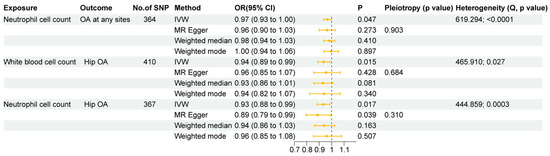 The enrichment analysis results indicated a potential association between OA-related genes and WBC function. Key OA-related genes identified in this study are also well-established biomarkers for WBCs, including CD4, a T cell biomarker, and CSF1R, a biomarker for monocytes. Previous studies have further confirmed that TYROBP is associated with WBC function, specifically in NK cells [59,60]. These associations prompted further investigation into the potential genetic relationship between circulating WBCs and OA. This study uses MR analysis and extensive GWAS data to explore the genetic relationship between circulating WBC counts and OA in European populations. As the most abundant WBC type, neutrophils are traditionally recognized for their role in rapidly initiating immune responses to inflammation and injury. Within the context of OA, neutrophil function has been increasingly studied, revealing a more complex role than previously understood [61,62,63]. Our genetic analysis provided evidence of a genetic association between elevated neutrophil cell counts and a reduced risk of OA at any site; similarly, increased circulating WBC and neutrophil cell counts showed a suggestive association with a decreased risk of hip OA.
