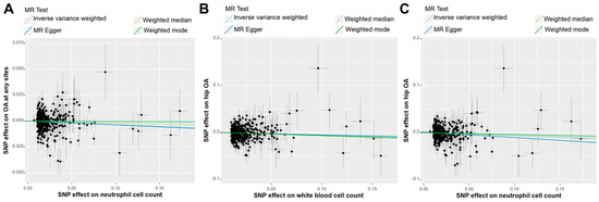 The scatter plots of causal effects. Scatter plots depicting the causal effects of neutrophil cell count on OA at any site (A), total white blood cell count on hip OA (B), and neutrophil cell count on knee OA (C).
