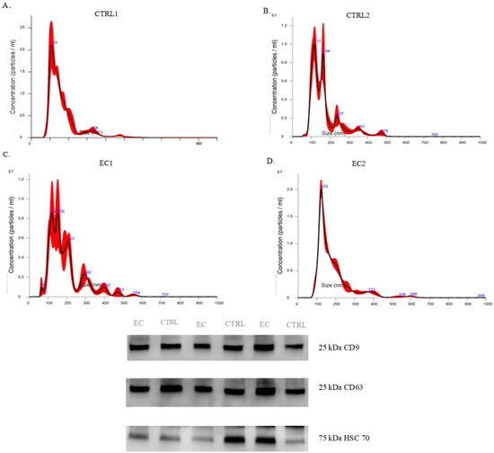 In contrast, CTRL 2 showed a vesicle concentration of 8.90 × 108 particles/mL with a modal value of 124.1 nm. EC patient 1 showed a vesicle concentration of 1.09 × 109 particle/mL and a modal value of 141.4 nm. In comparison, EC patient 2 showed a vesicle concentration of 1.59 × 109 particles/mL and a distribution of 124.1 nm. We performed western blotting (Figure 1B) of common exosome markers CD63 and CD9 and cytosolic proteins in EV markers HSC70 to check the good performance of the EV isolation kit (Figure S1). All in one, these data indicate that the vesicles obtained are exosomes.