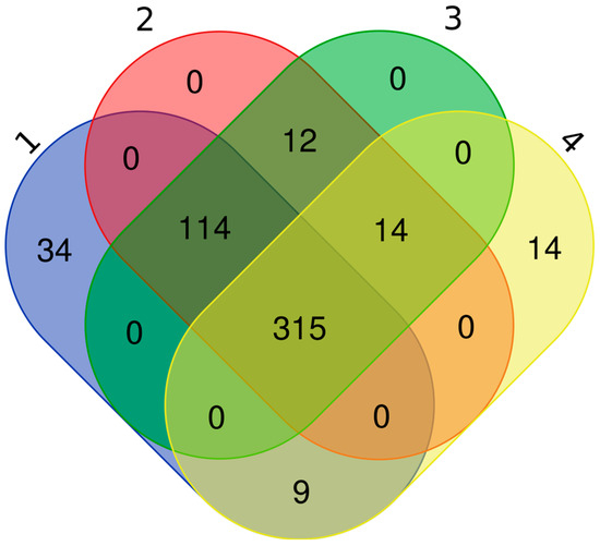 Intersection of identified proteins by four different tools: Chimery, Sequest, Amanda, and Inferys by Venn Diagram. These tools have been combined (Chimerys + Amanda and Chimerys + Amanda + Sequest, Amanda + Sequest + Inferis) to identify as many proteins as possible. 1—Chymeris, 2—Chymeris + Amanda, 3—Chymeris + Amanda + Sequest, 4—Amanda + Sequest + Inferis.