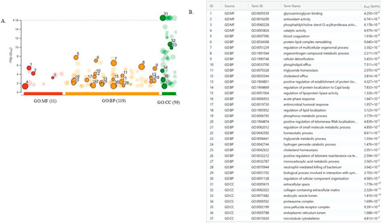 In the next step, we performed a bioinformatic analysis using the gProfiler tool to understand the functional impact of differently abundant proteins between EC serum exosomes versus serum exosomes from controls (Figure 4).