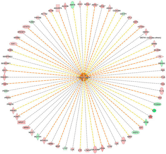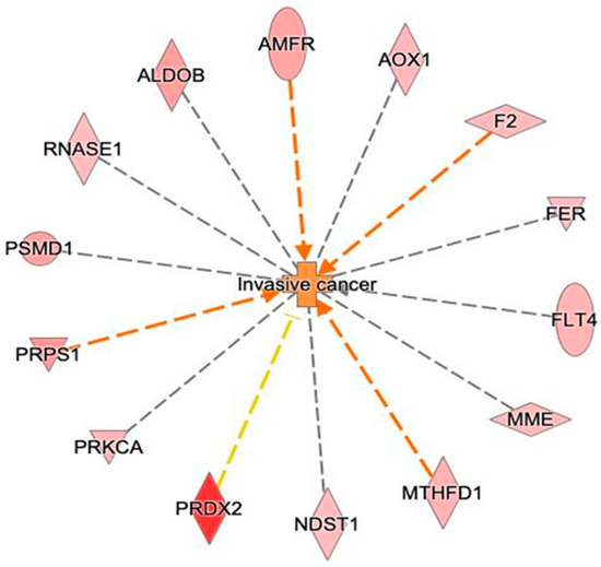 Ingenuity Pathway Analysis (IPA) showed that 66 identified proteins are related to the top network corresponding to invasive cancer (Figure 6).