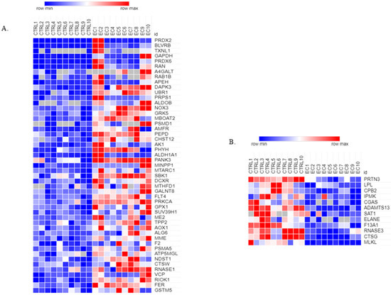 Heat map of (A) 49 more abundant proteins in EC; (B) 12 less abundant proteins in EC raw data expression proteins using the Morpheus tool.