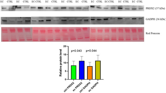 The PRDX2 and GADPH protein alteration in endometrial cancer (ec) and normal endometrium (ctrl) was confirmed using Western blot analysis. The intensity of immunostained bands was normalized against the total protein intensities measured from the same blot stained with Red Ponceau. Results are displayed as a histogram (p < 0.05), and each bar represents mean ± standard deviation.